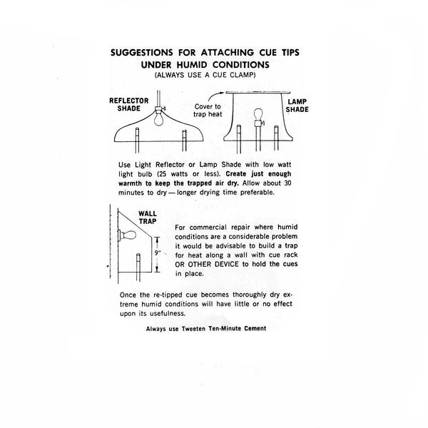 Apply a thin coat of cement to tip and cue. Let stand until cement becomes gummy, then press firmly on cue and let stand for ten minutes and it is ready to finish.