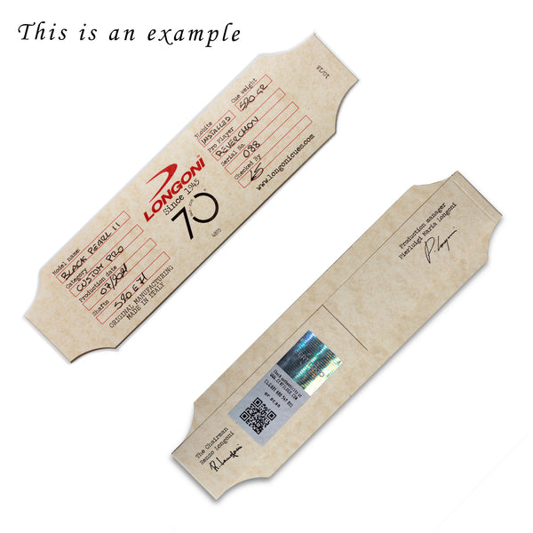 - Included with the cue: Longoni Joint Protectors (Made in Italy), Longoni Tip Protector, Longoni Soft Case, Longoni Patch, Longoni Cue Certificate